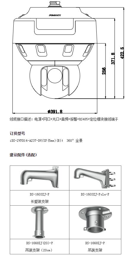 星光級360°全景一體式網絡高清紅外智能球機(iDS-2VPD14-A237-DV/SP(5mm)(B))